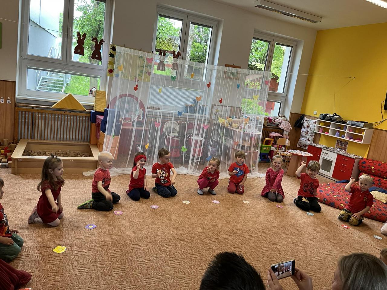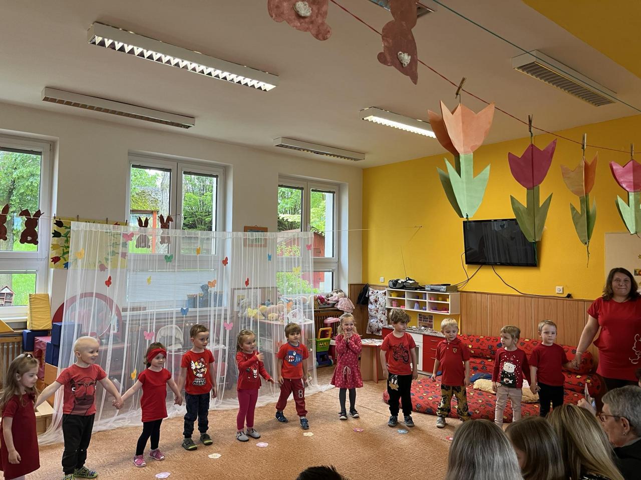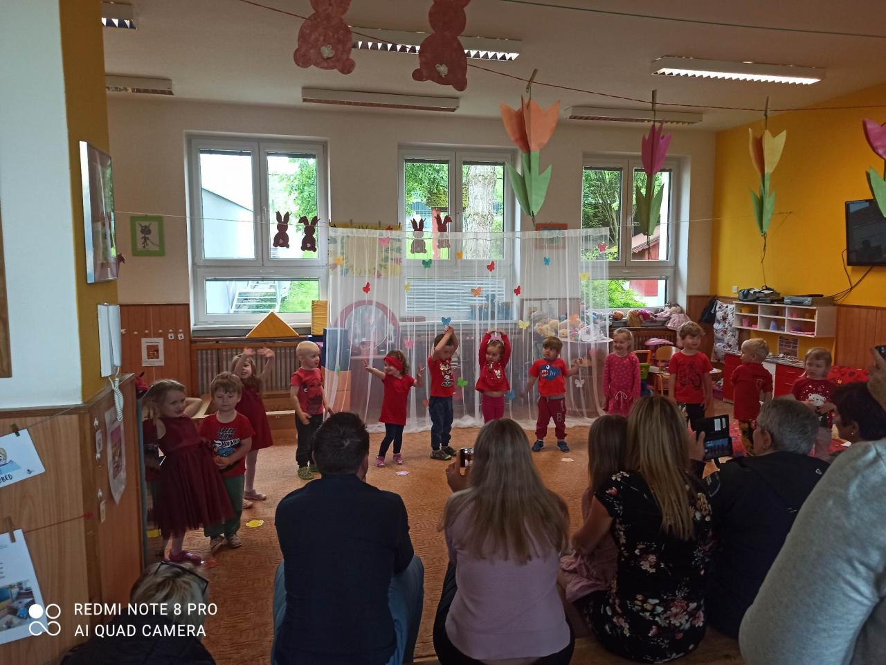 Ve čtvrtek 25.5. odpoledne se konala tradiční besídka, na které děti předvedly básničky, písničky "Naše Země kulatá", "Cib, cib, cibulenka", "Maminka" a taneček "Mateřinky". Na závěr děti předaly maminkám vyrobené srdíčko a kytičku z papíru. Děti se moc snažily udělat maminkám radost.
