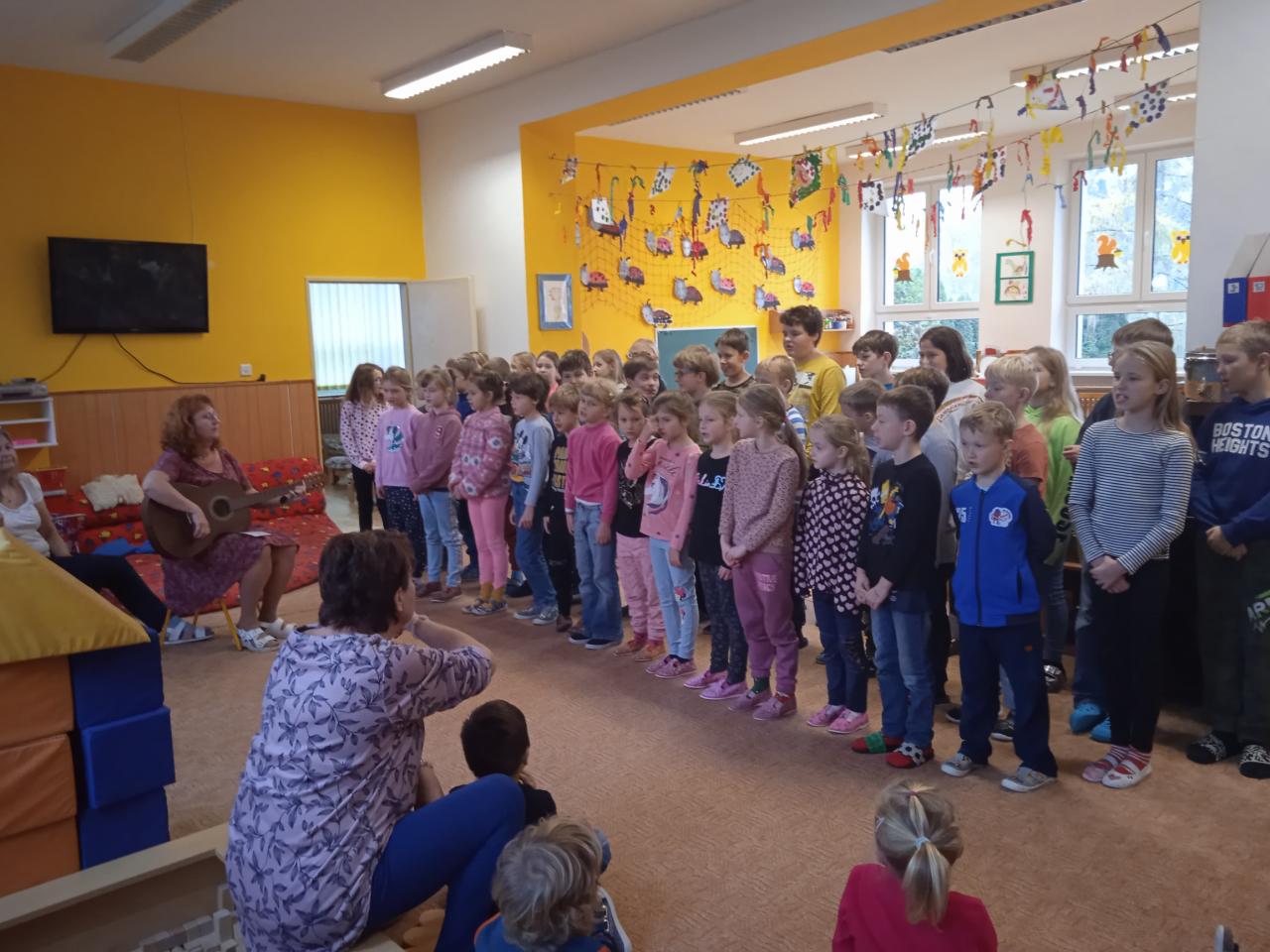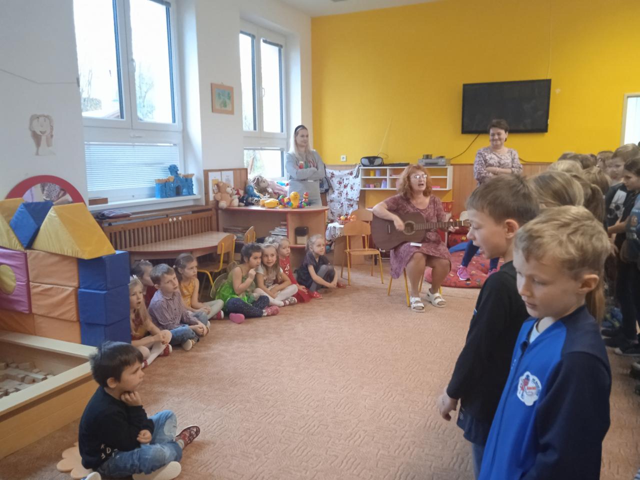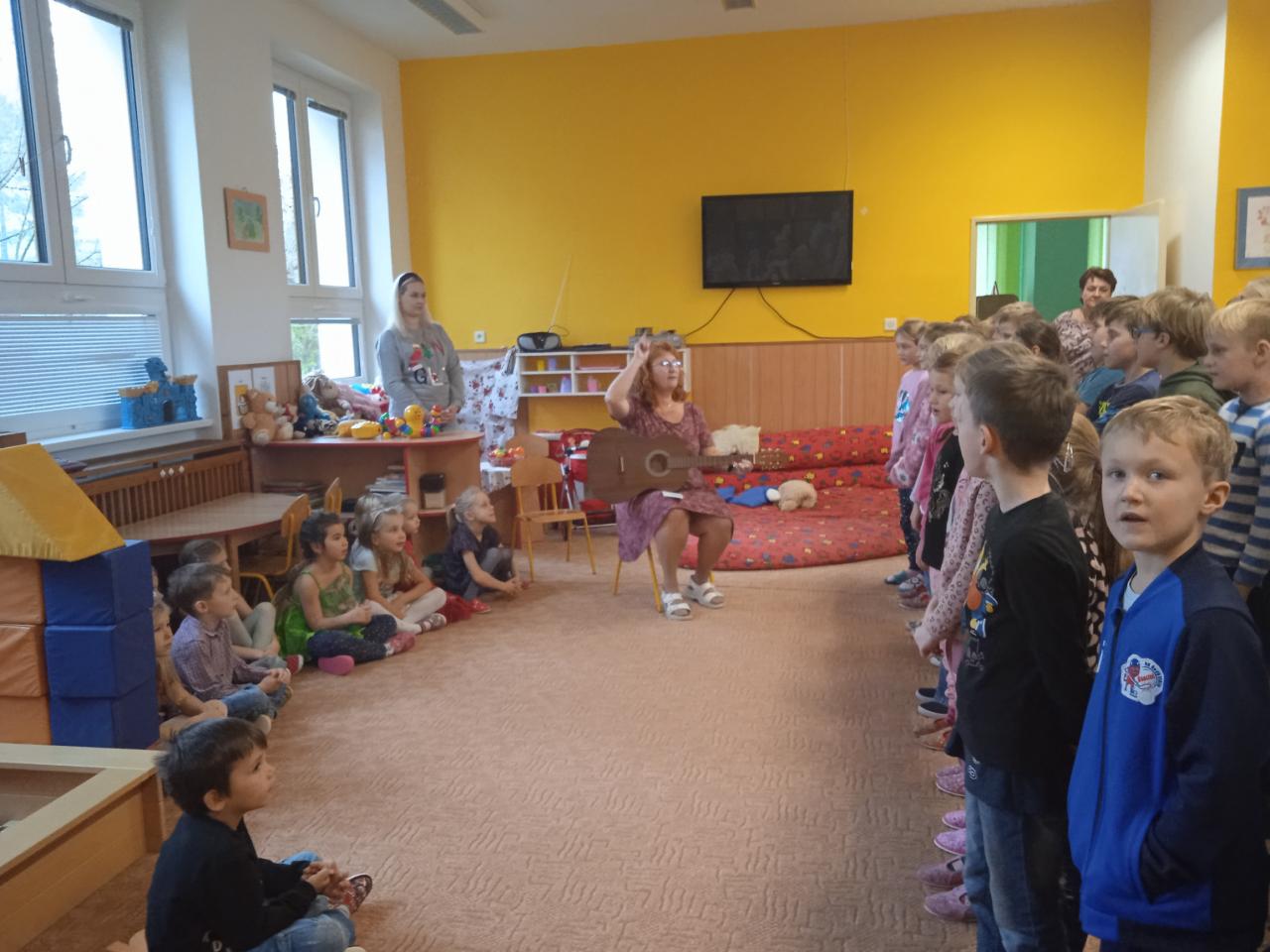 V týdnu od 21.11.- 25.11. jsme věnovali tématu oblékání a obouvání v různých ročních obdobích. V pátek nás navštívily děti ze ZŠ s pásmem vánočních písní. Na kytaru je doprovázela paní učitelka Pavlína Pokorná. Vystoupení se školákům velice povedlo.