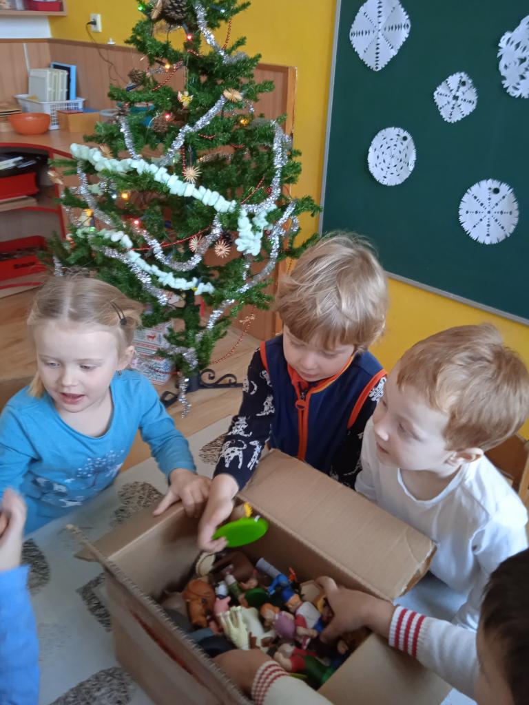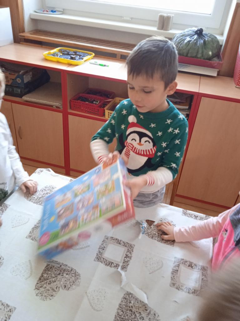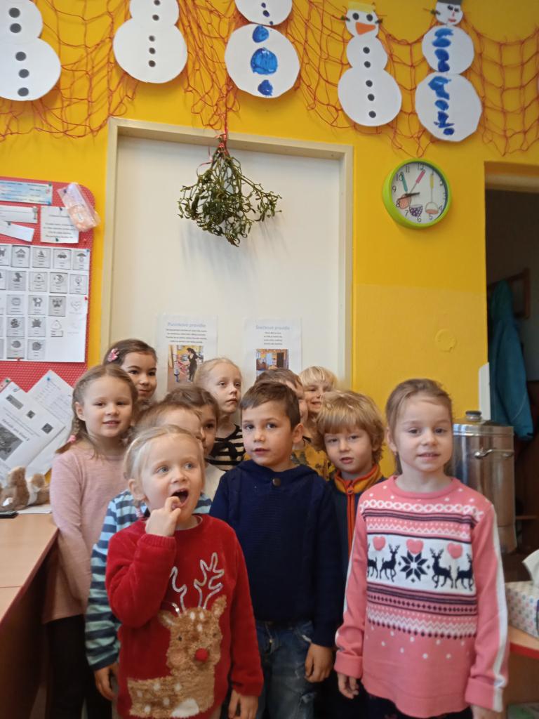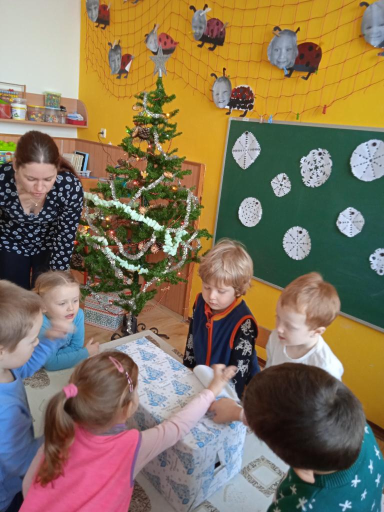 V poslední předvánoční týden 19. - 22.12. k nám přišel Ježíšek s nadílkou, dětem se dárky velice líbily. Také jsme se věnovali vánočním zvykům - pověsili jsme si jmelí, rozkrojili jablíčko a pouštěli lodičky se svíčkou. Na adventním věnci jsme zapálili poslední čtvrtou svíčku. Eva H.