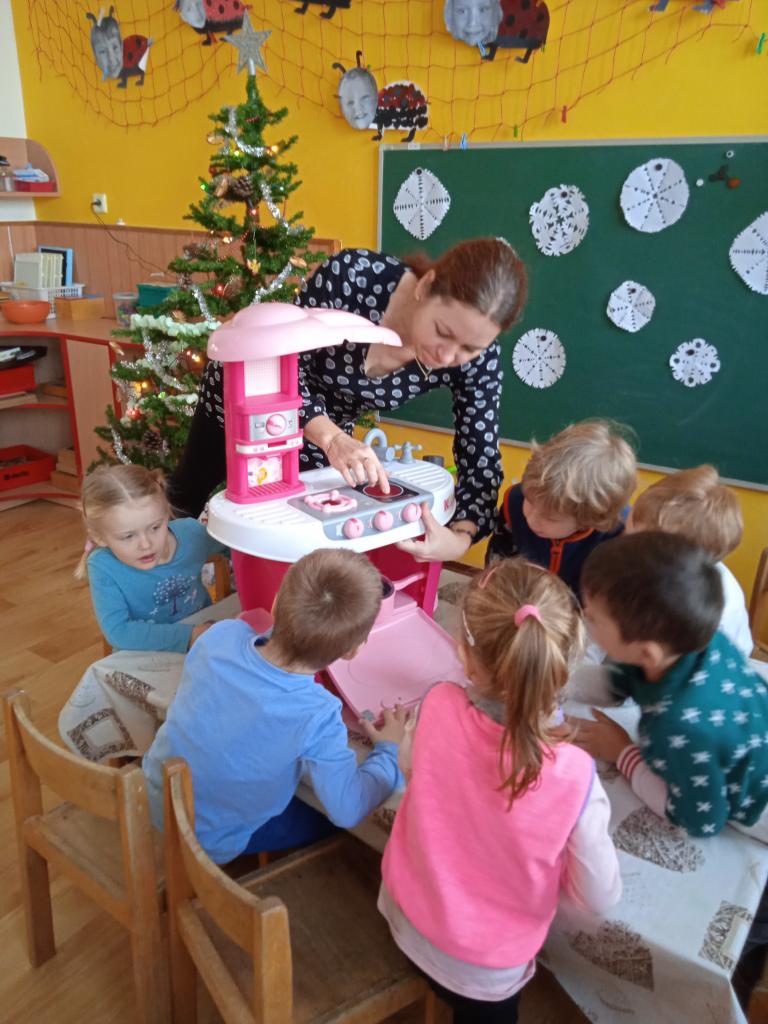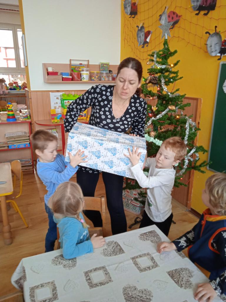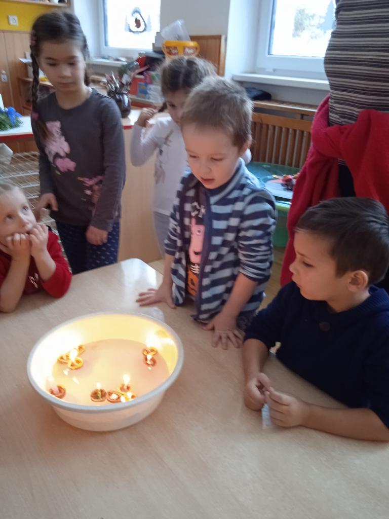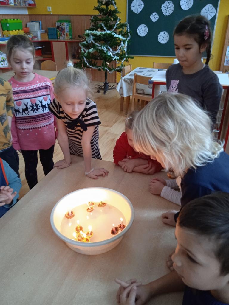 V poslední předvánoční týden 19. - 22.12. k nám přišel Ježíšek s nadílkou, dětem se dárky velice líbily. Také jsme se věnovali vánočním zvykům - pověsili jsme si jmelí, rozkrojili jablíčko a pouštěli lodičky se svíčkou. Na adventním věnci jsme zapálili poslední čtvrtou svíčku. Eva H.