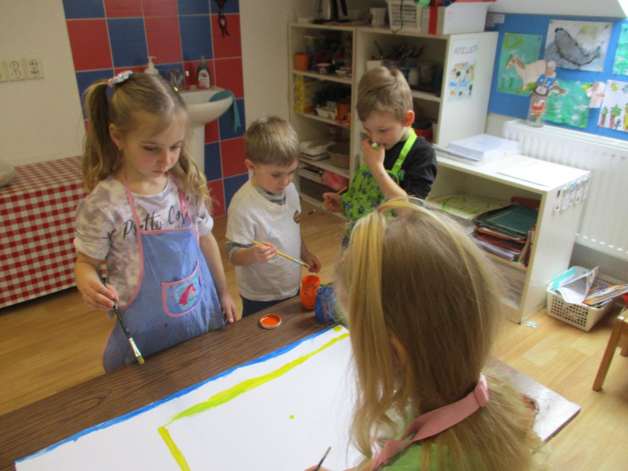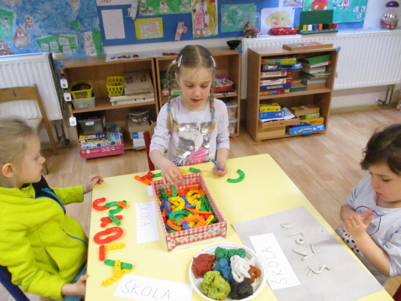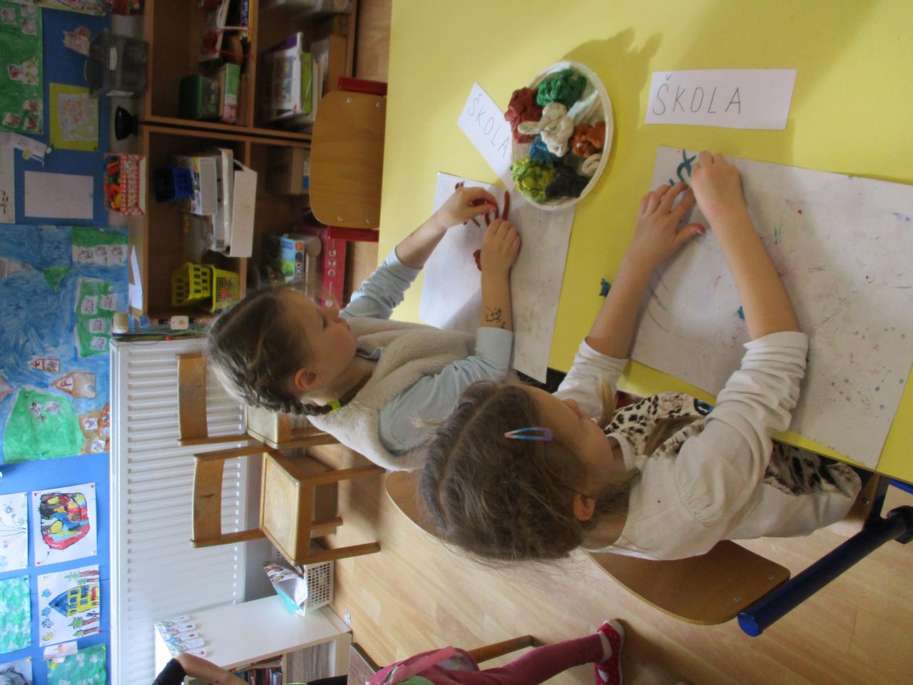Hned po Velikonocích jsme si začali povídat o škole, co se tam učí, proč tam budeme chodit. Malovali jsme školu, skládali písmena, hráli si na školu, "psali diktát". Zkoušeli jsme si pravou a levou stranu, zpívali jsme a učili se básničku.