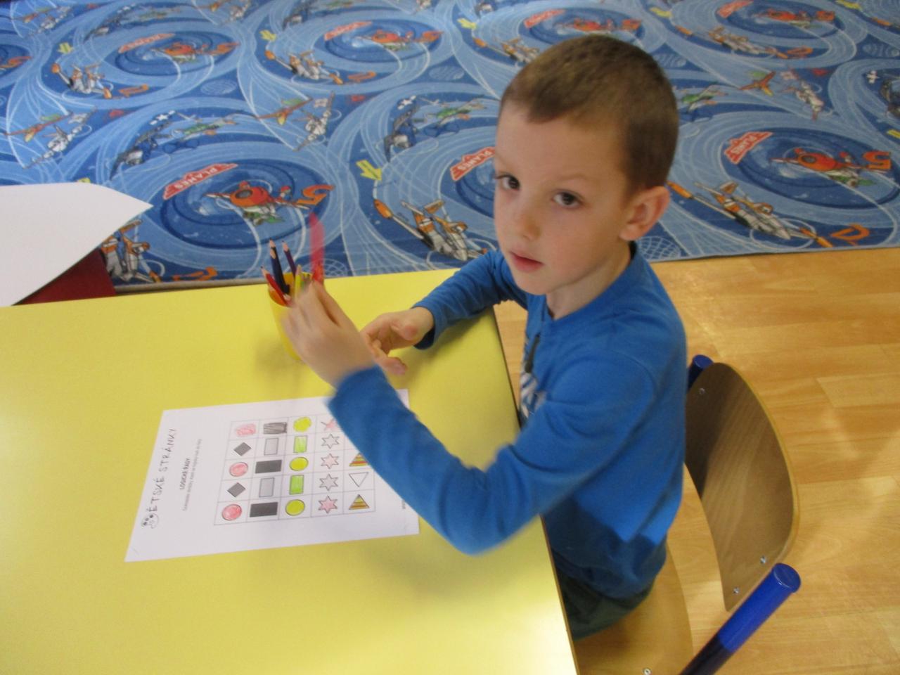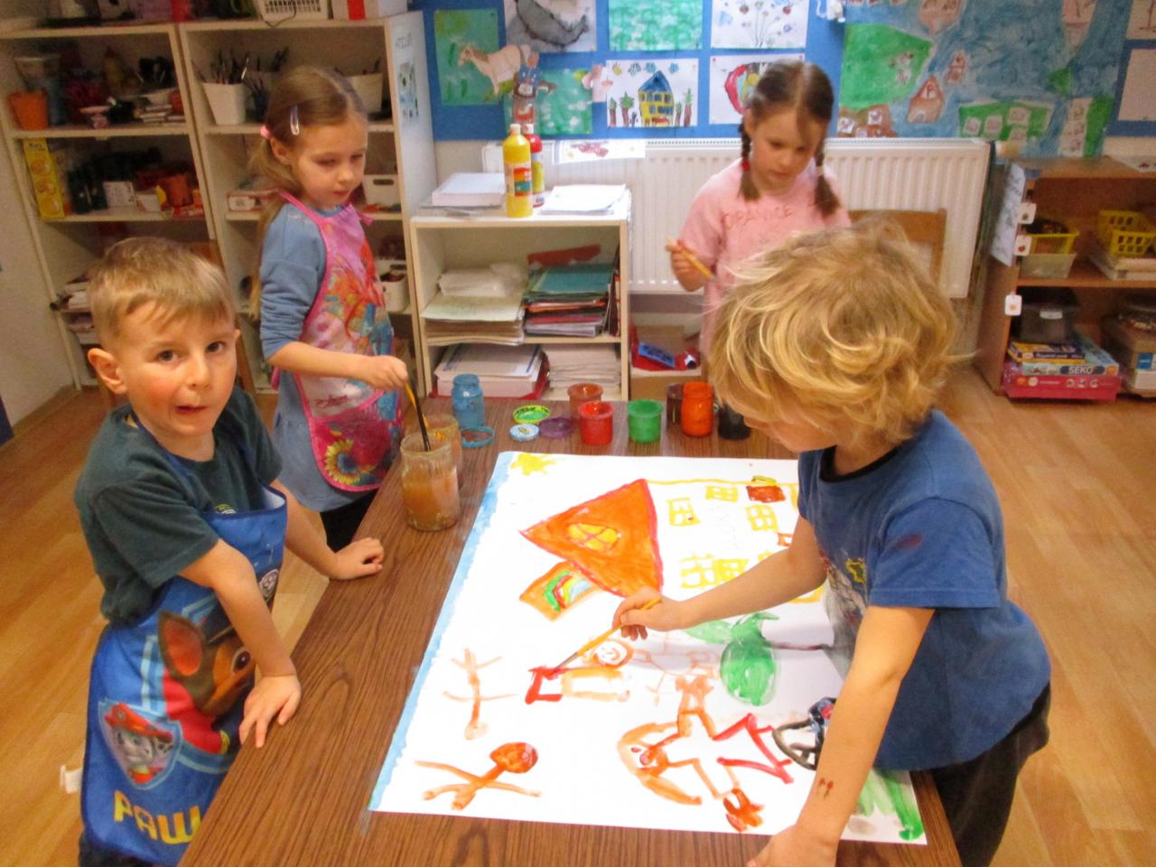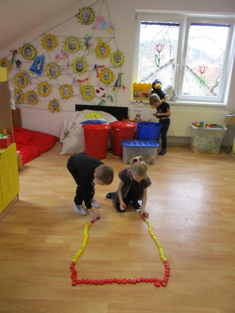 Hned po Velikonocích jsme si začali povídat o škole, co se tam učí, proč tam budeme chodit. Malovali jsme školu, skládali písmena, hráli si na školu, "psali diktát". Zkoušeli jsme si pravou a levou stranu, zpívali jsme a učili se básničku.