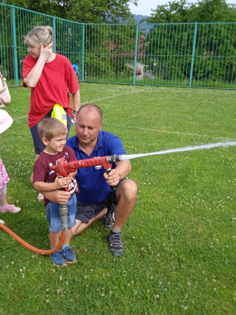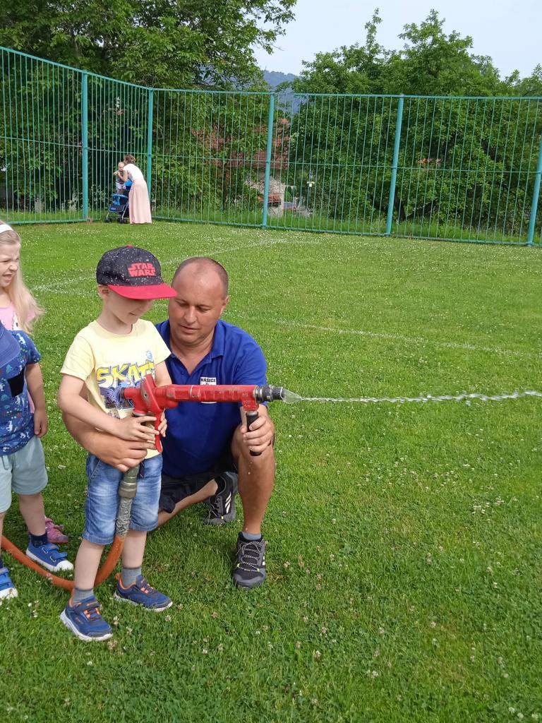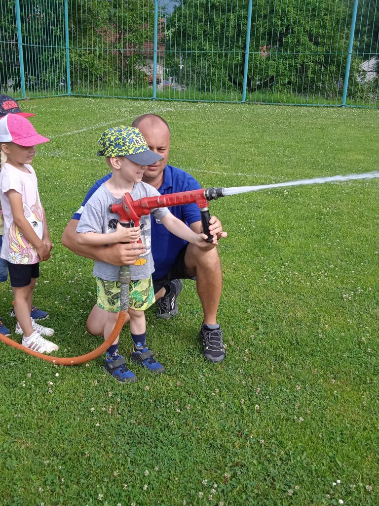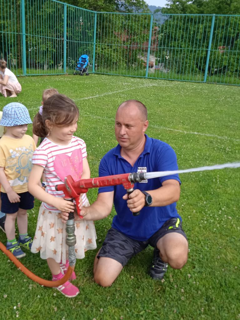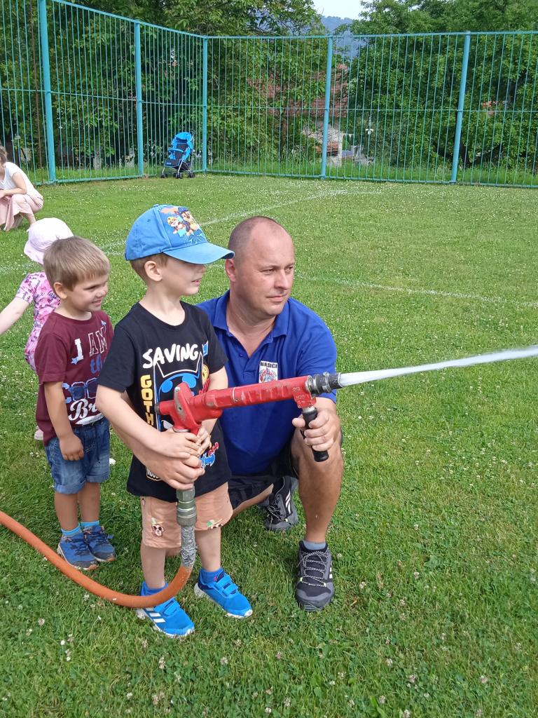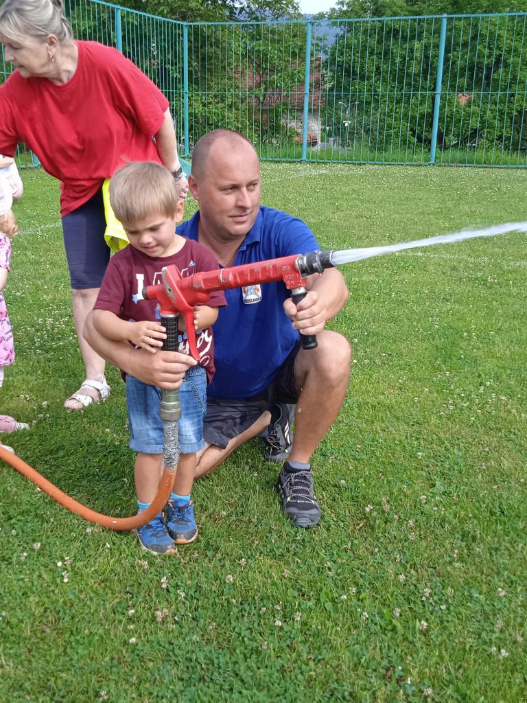 U fotbalového hřiště dětem předvedl hasičské auto a vybavení, dětem pro radost zahoukal a zablikal. Na hřišti si děti zkusily stříkat stříkačkou a na závěr se i pod stříkačkou osvěžily. Eva H.