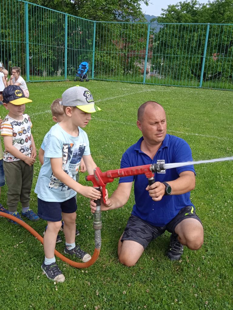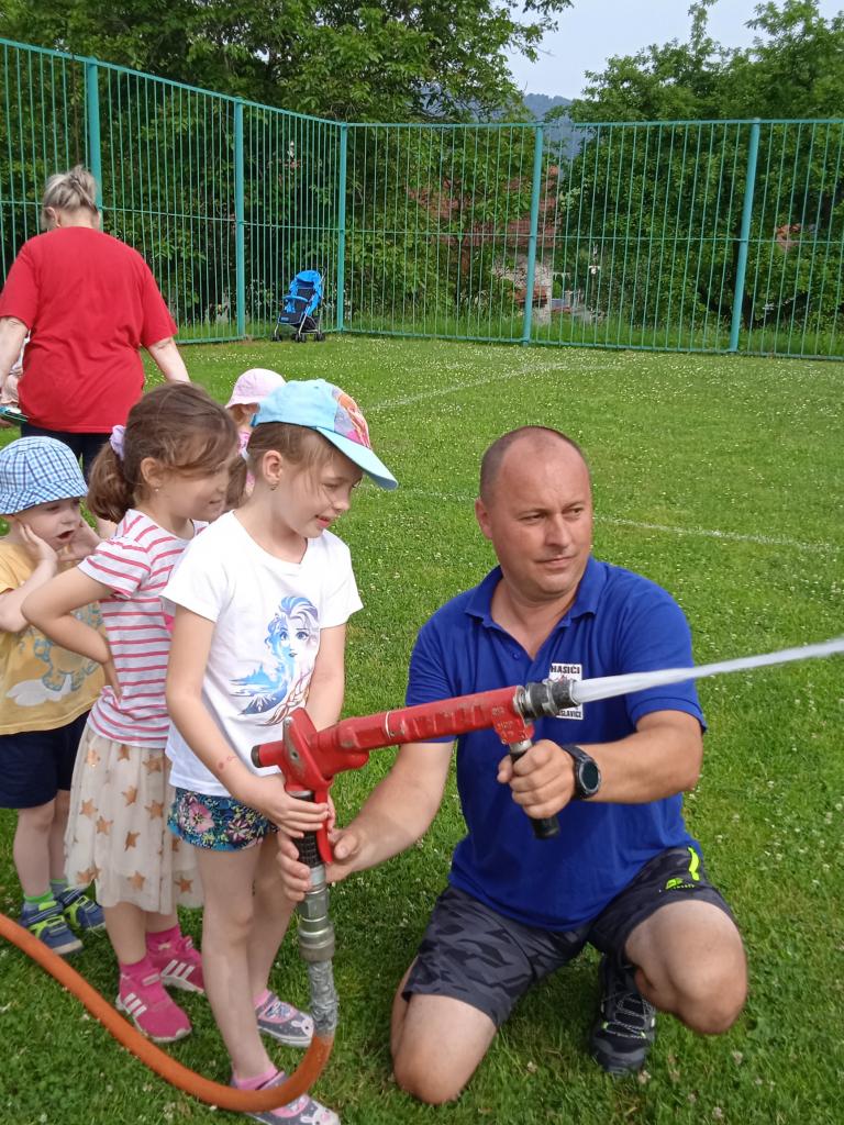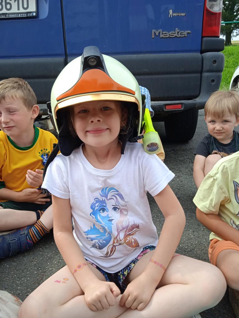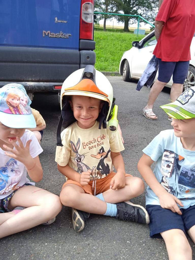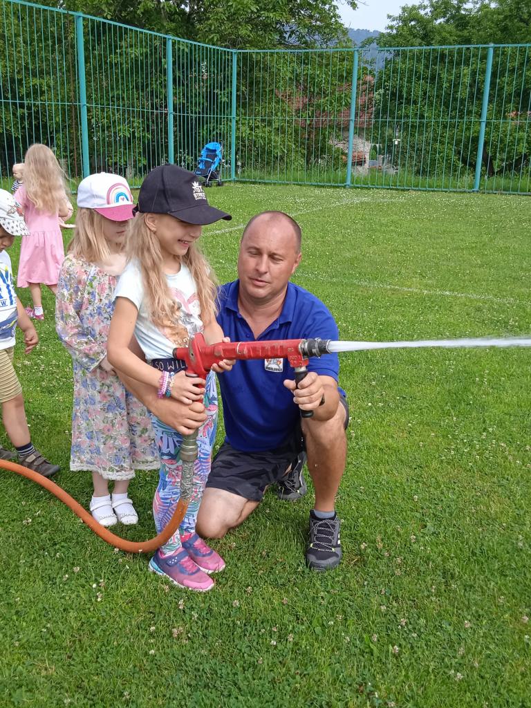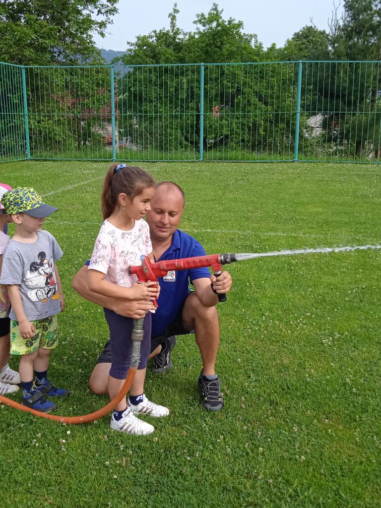 U fotbalového hřiště dětem předvedl hasičské auto a vybavení, dětem pro radost zahoukal a zablikal. Na hřišti si děti zkusily stříkat stříkačkou a na závěr se i pod stříkačkou osvěžily. Eva H.