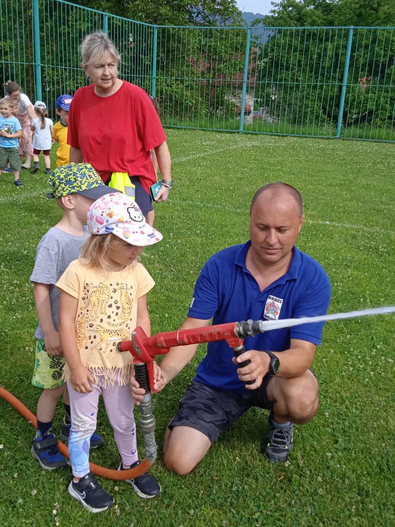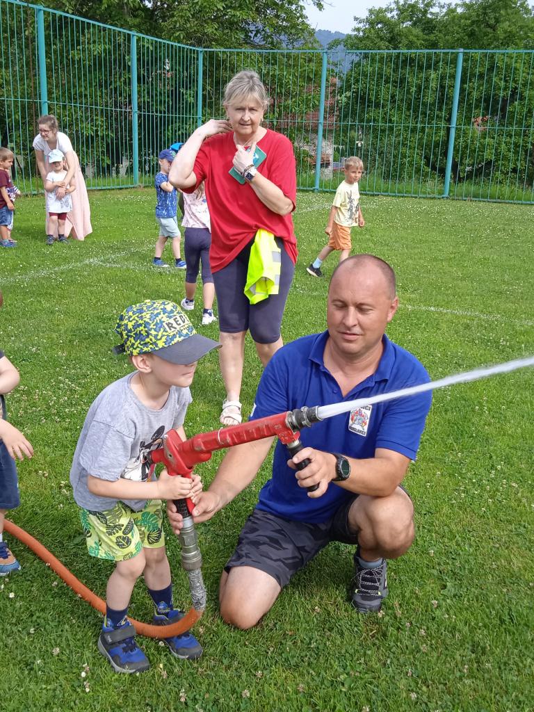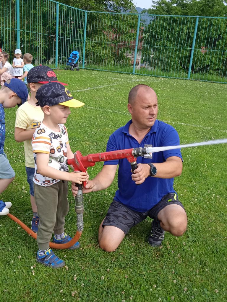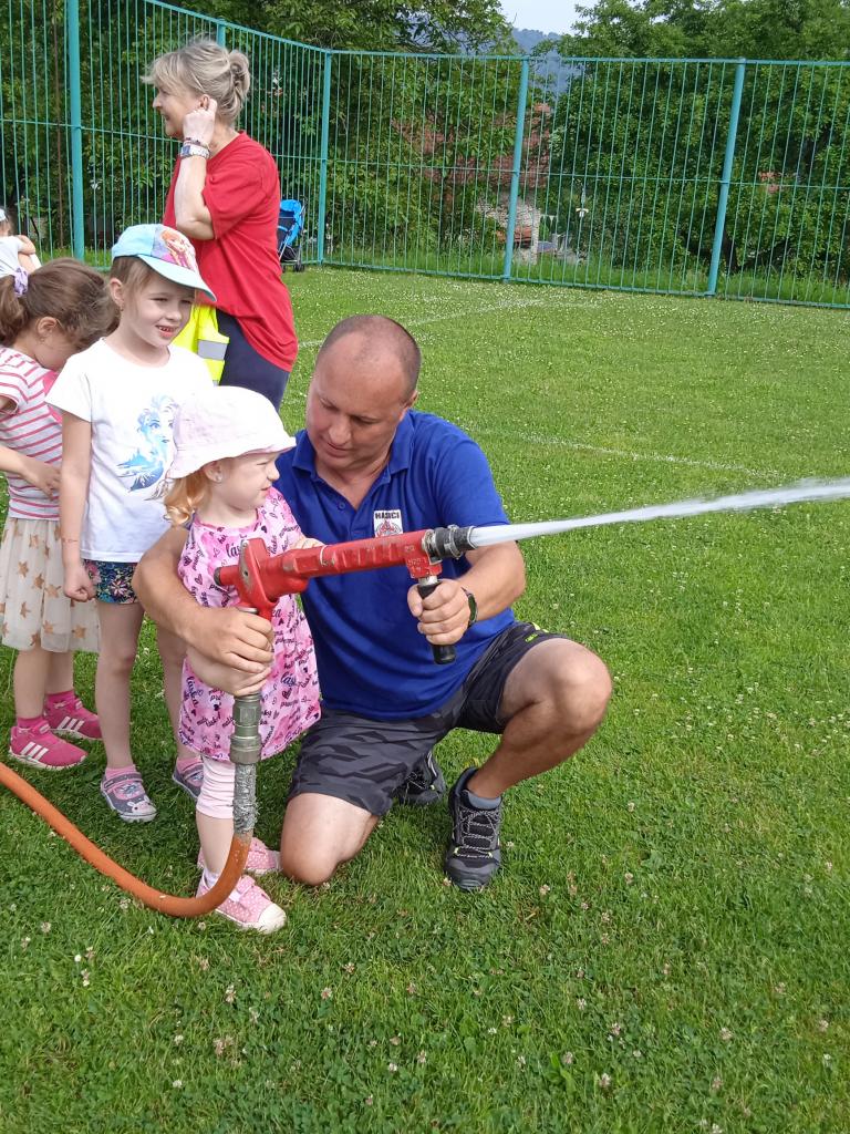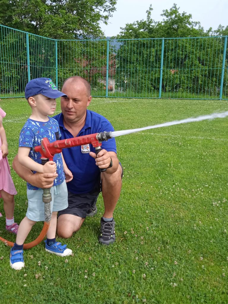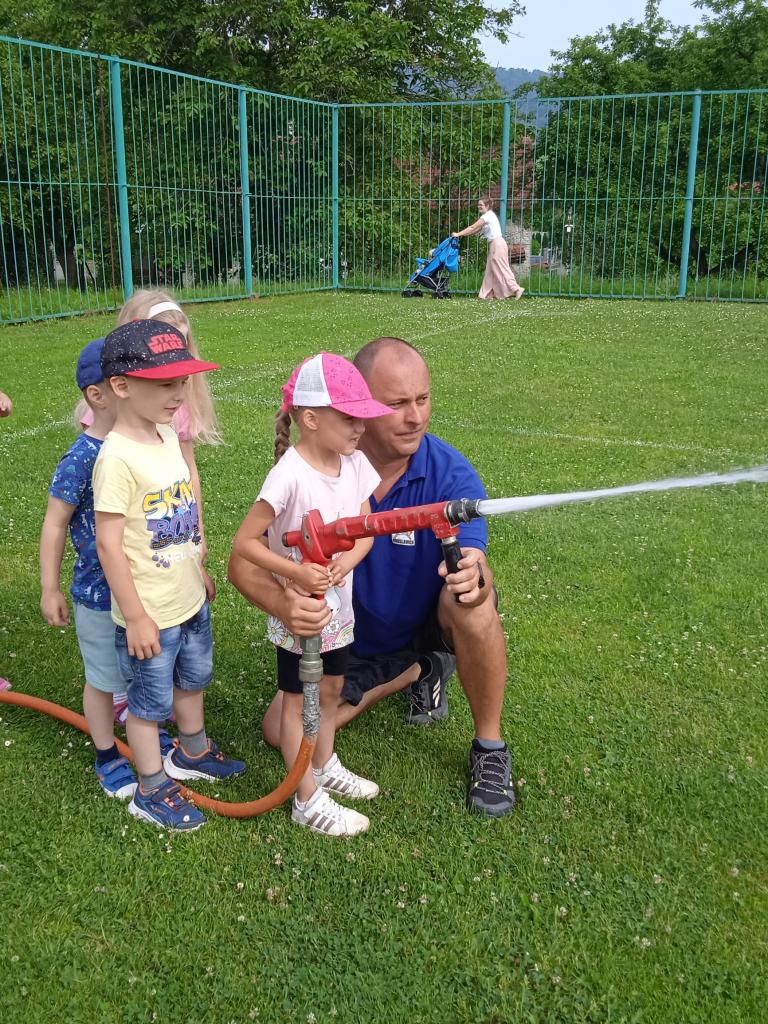 U fotbalového hřiště dětem předvedl hasičské auto a vybavení, dětem pro radost zahoukal a zablikal. Na hřišti si děti zkusily stříkat stříkačkou a na závěr se i pod stříkačkou osvěžily. Eva H.