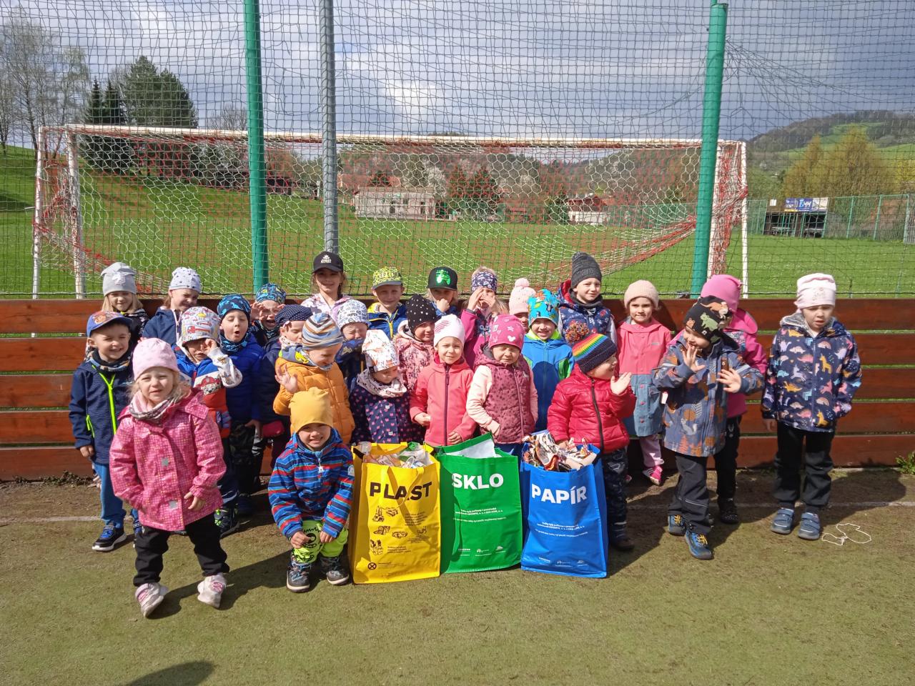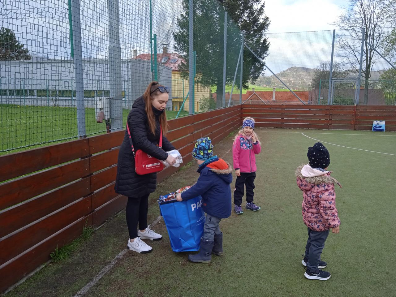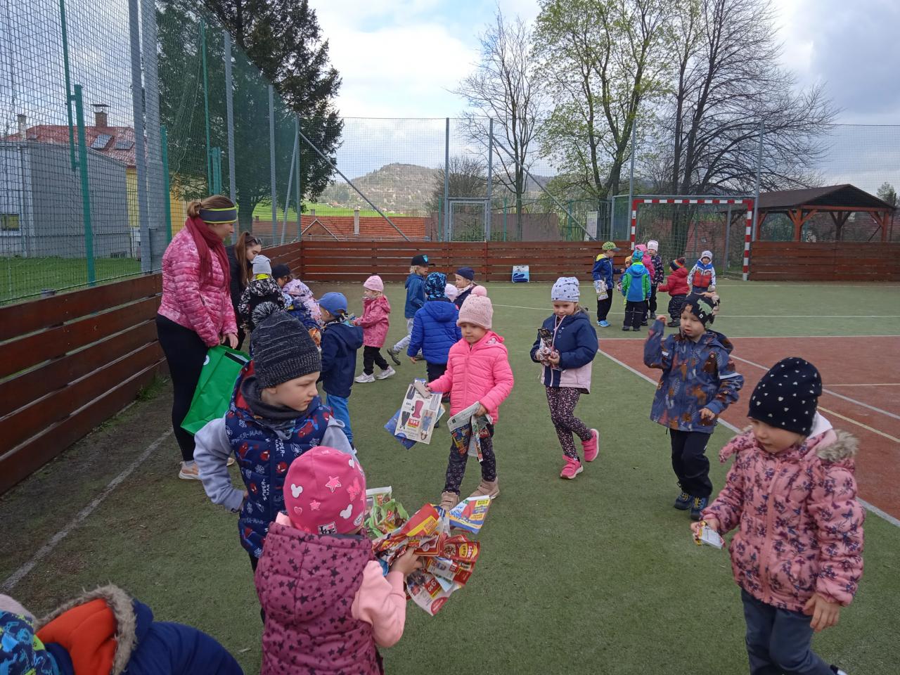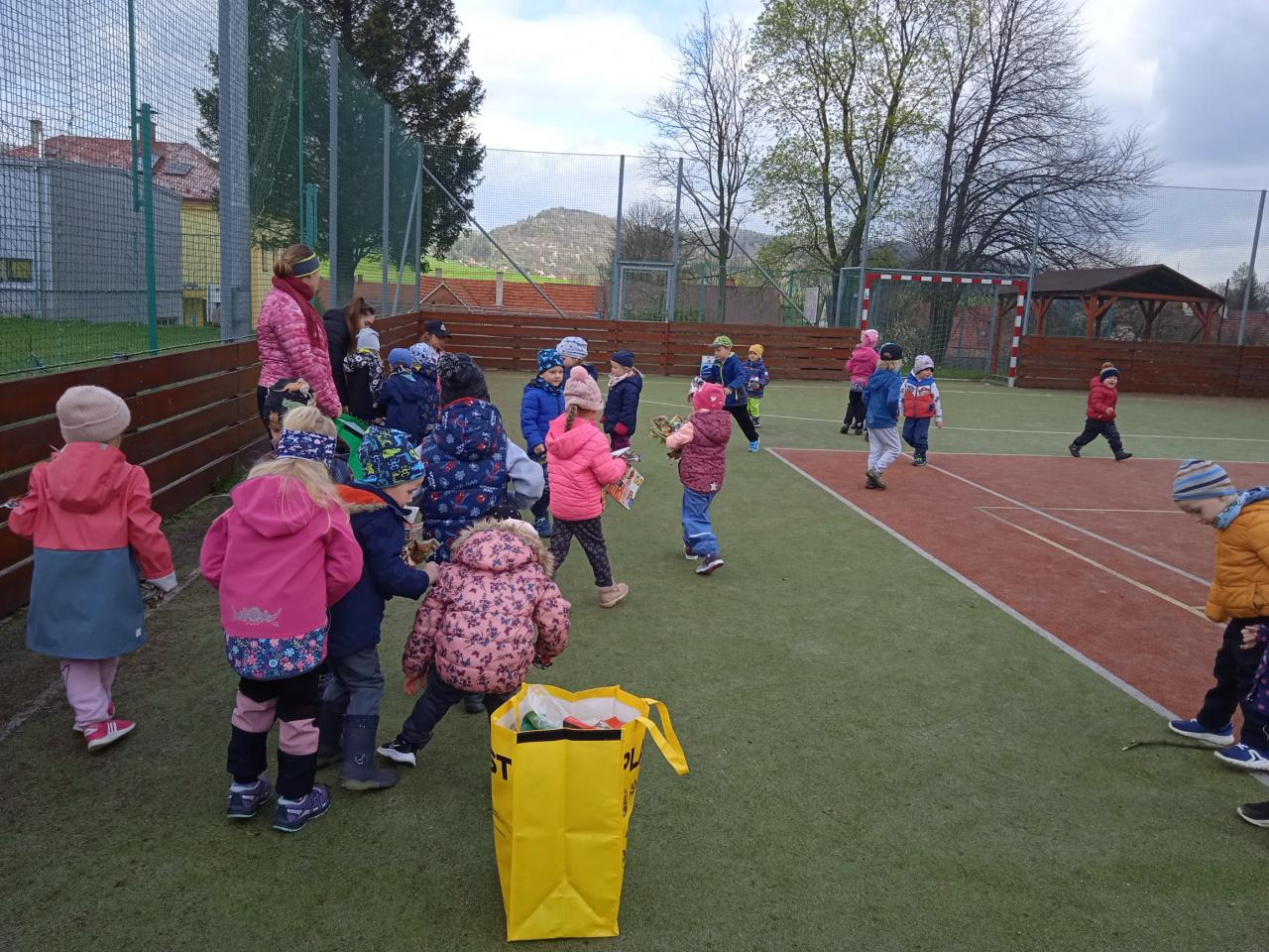 27.4. měli projektový den Sluníčka a Berušky. V tělocvičně děti plnily úkoly s ekologickou tématikou. Poté jsme se přesunuli na multifunkční hřiště, které bylo plné odpadků. Děti hřiště uklidily, odpadky správně vytřídily a odnesly do kontejnerů na tříděný odpad. Eva H.