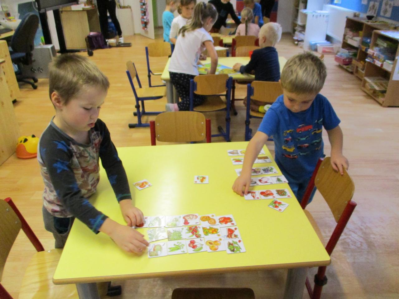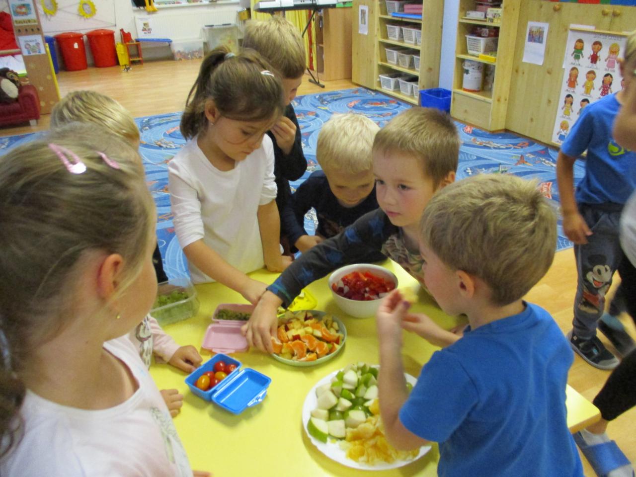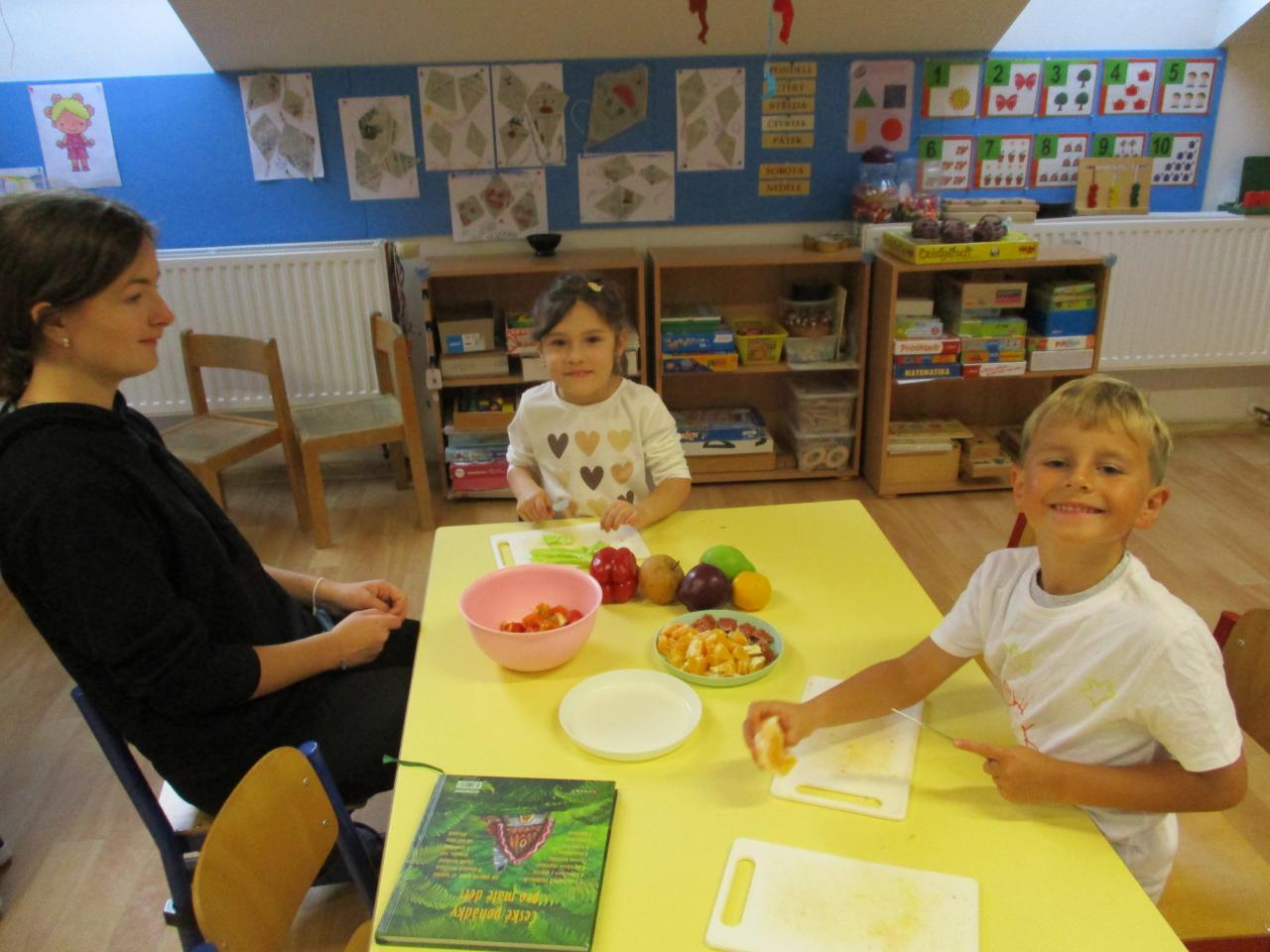 O ovoci a zelenině jsme si nejen povídali, ale i ochutnávali. Děti si přinesly z domova různé druhy ovoce a zeleniny, nakrájely a vzájemně ochutnávaly. Skládaly puzzle, obkreslovaly šablony, mačkaly kuličky a vytvářely obrázky. Děkujeme rodičům za vitamíny.