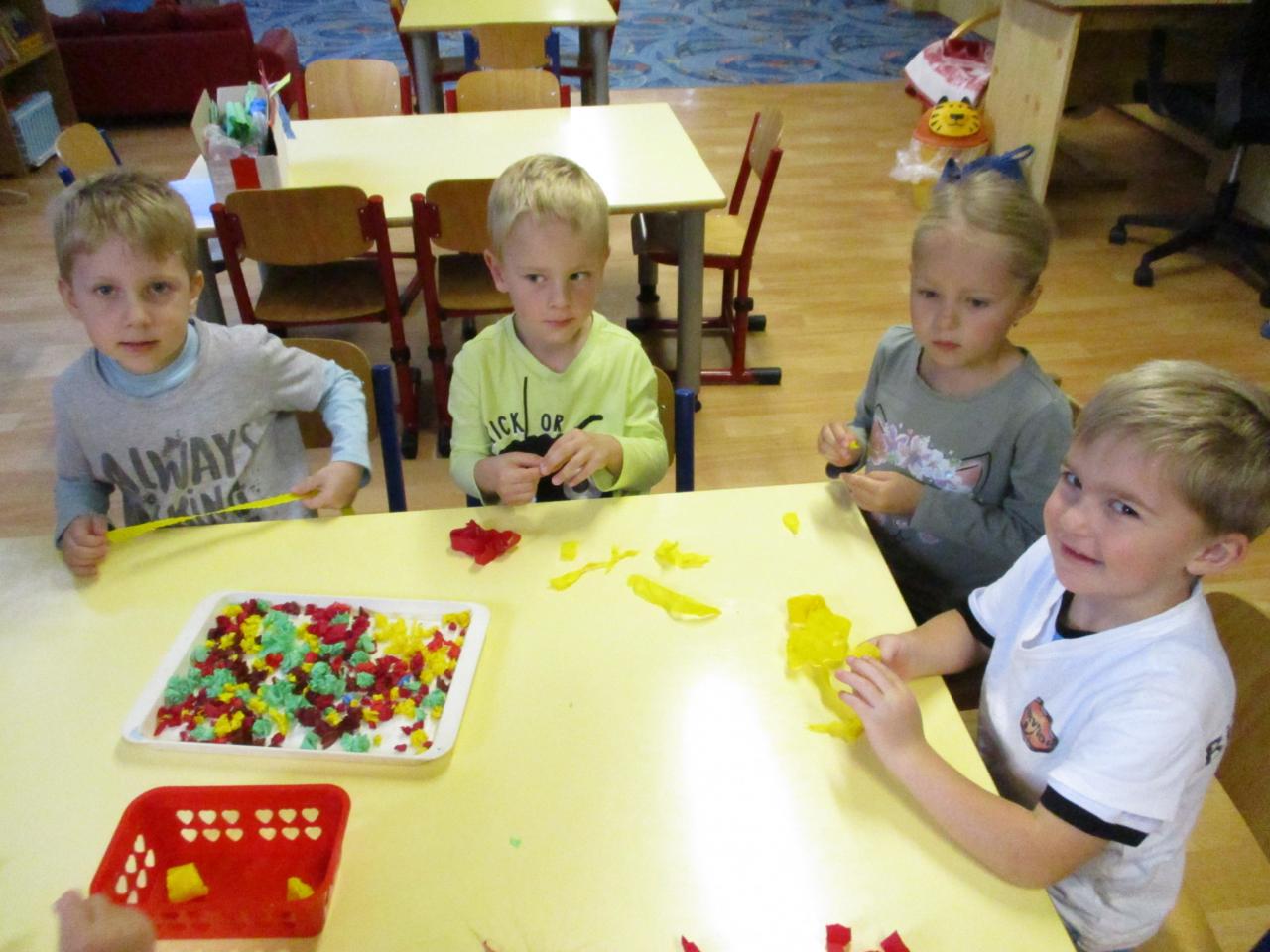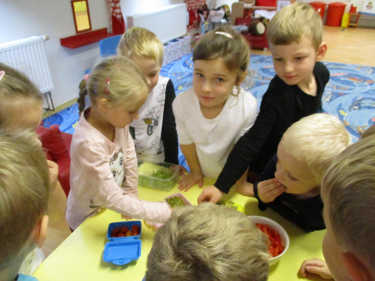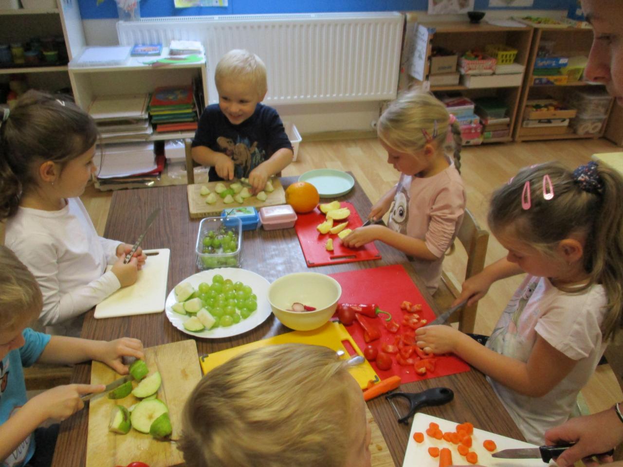 O ovoci a zelenině jsme si nejen povídali, ale i ochutnávali. Děti si přinesly z domova různé druhy ovoce a zeleniny, nakrájely a vzájemně ochutnávaly. Skládaly puzzle, obkreslovaly šablony, mačkaly kuličky a vytvářely obrázky. Děkujeme rodičům za vitamíny.