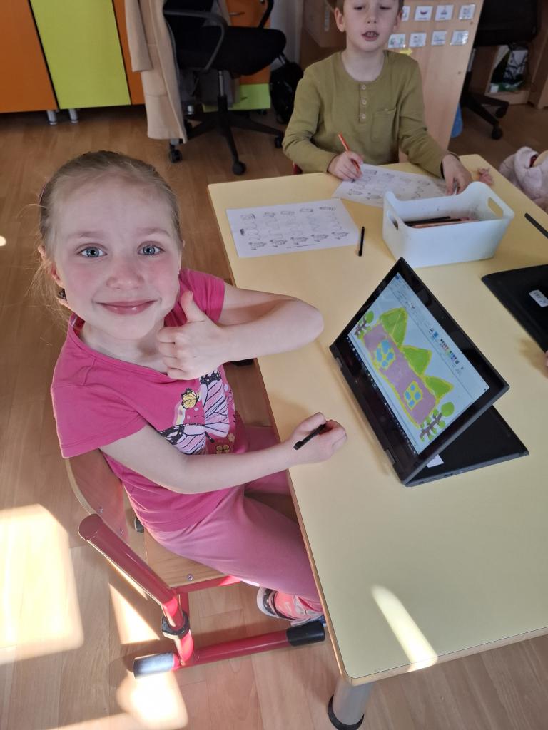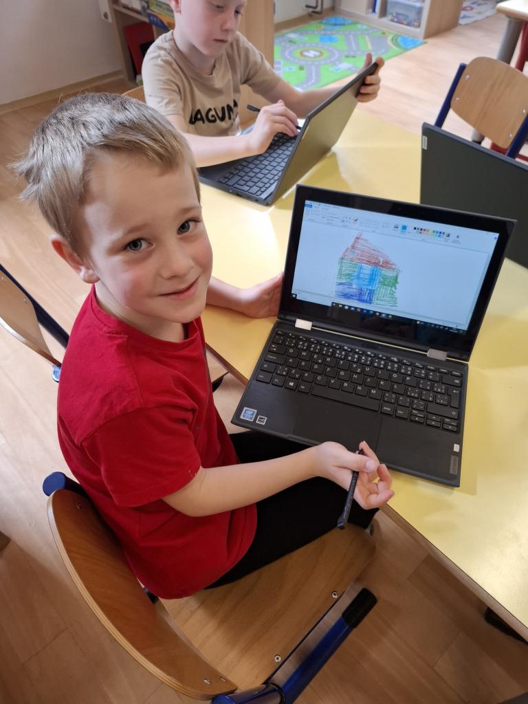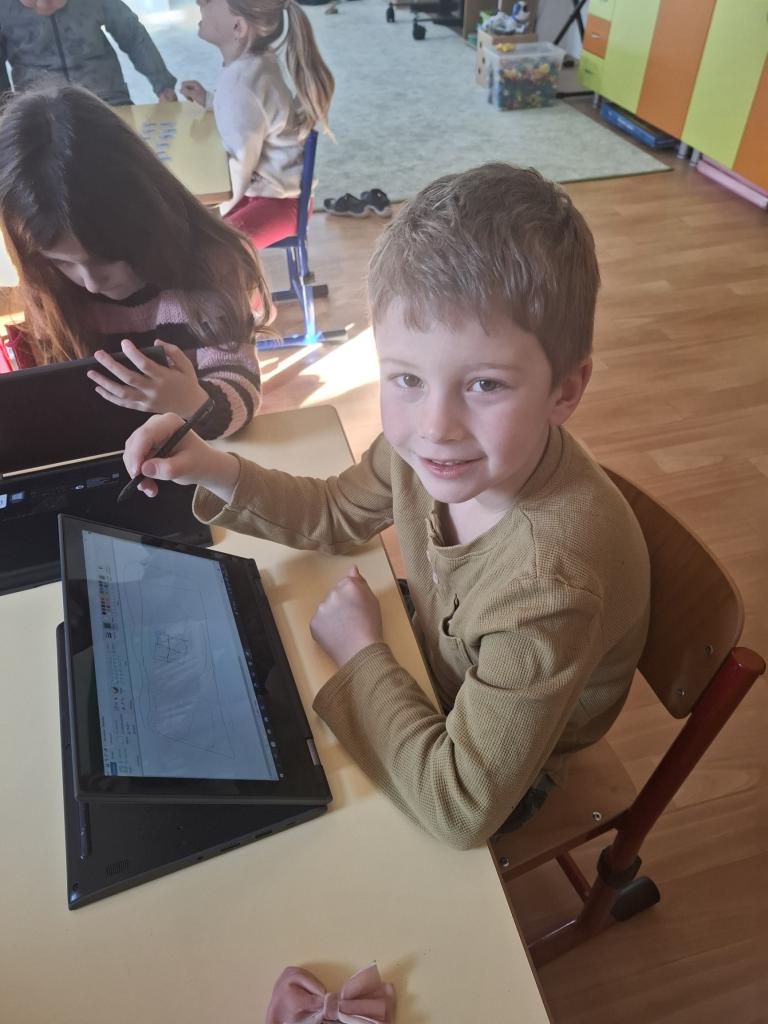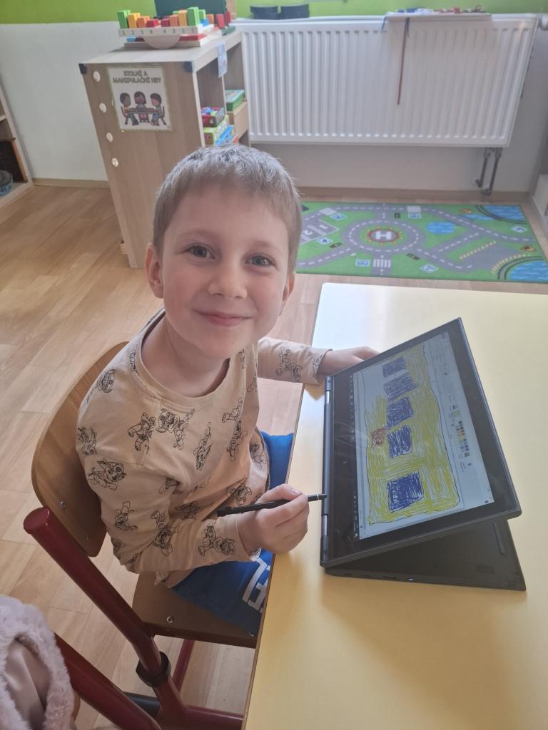 Využití PC - děti kreslily školu. Vymyslely a ozdobily si také svou aktovku. Tvořili jsme přání k blížícímu se svátku maminek pomocí holící pěny, tuše, fixů a obtisku ruličky.
