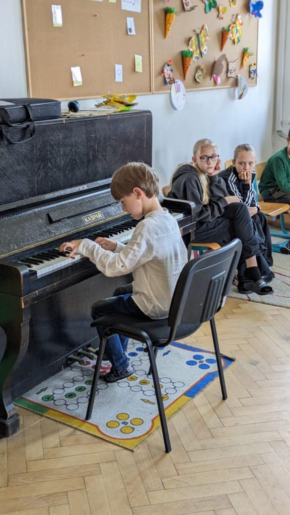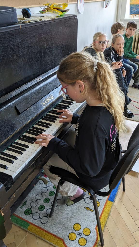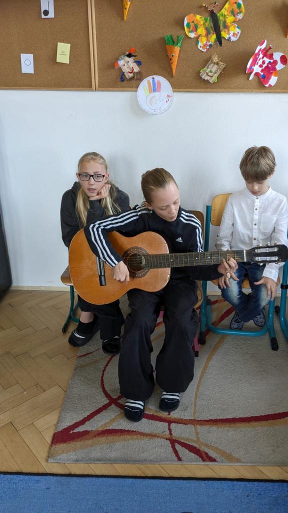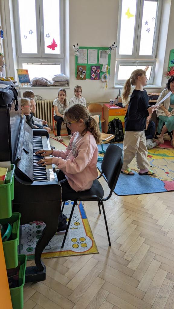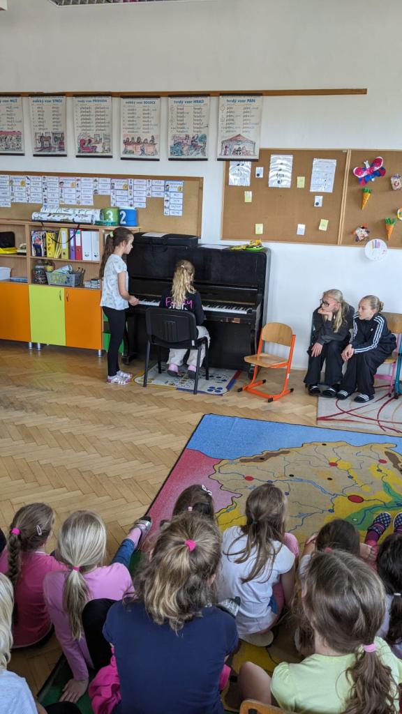 Začali jsme pěkně z vesela písničkou "Není nutno" za klavírního doprovodu naší žákyně Beátky Pleškové. Po ní následovali další účinkující Anička Velartová, Terezka Horáková, Lucinka Jaroňová a Max Palacký.Všichni muzikanti předvedli bravurní výkon na klavír. A jelikož nemáme jen šikovné klavíristy, ale i kytaristy, vystoupila také naše kytaristka Kristýnka Hubová. Všechny talentované vystupující chceme velmi pochválit za jejich píli, dřinu a skvělý výkon!