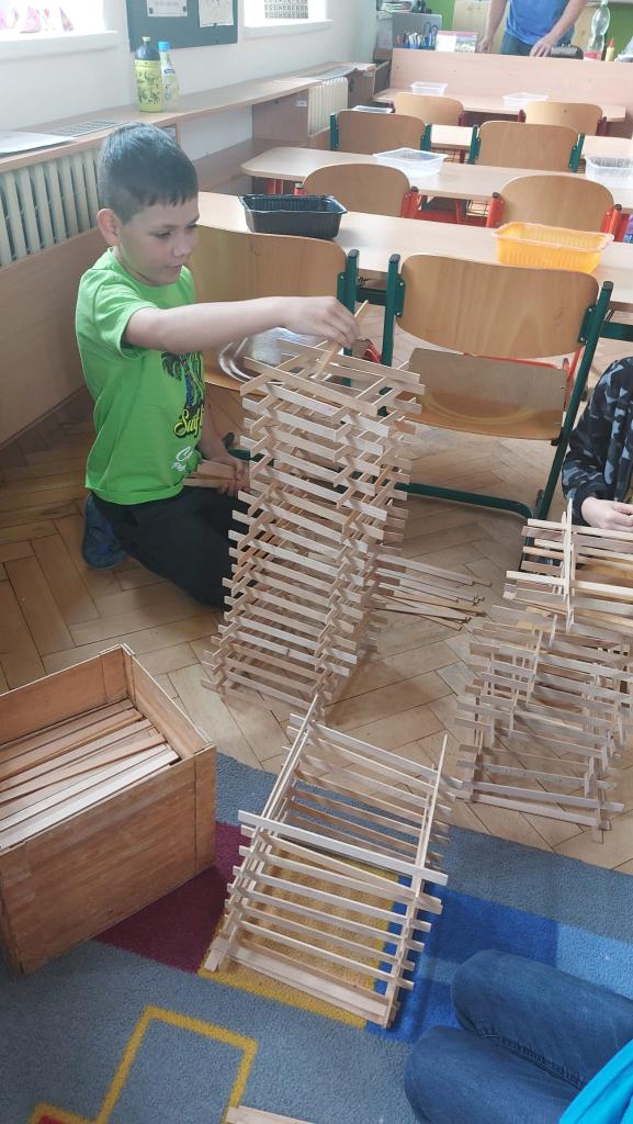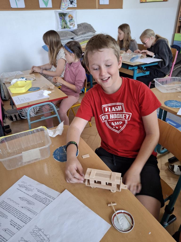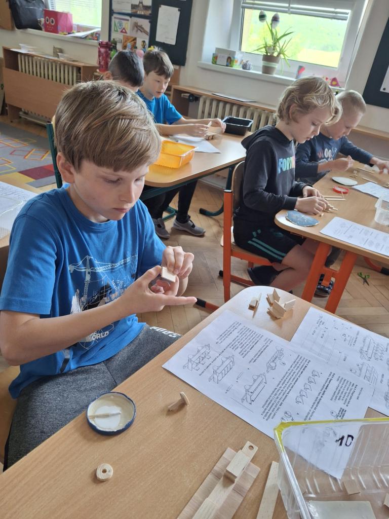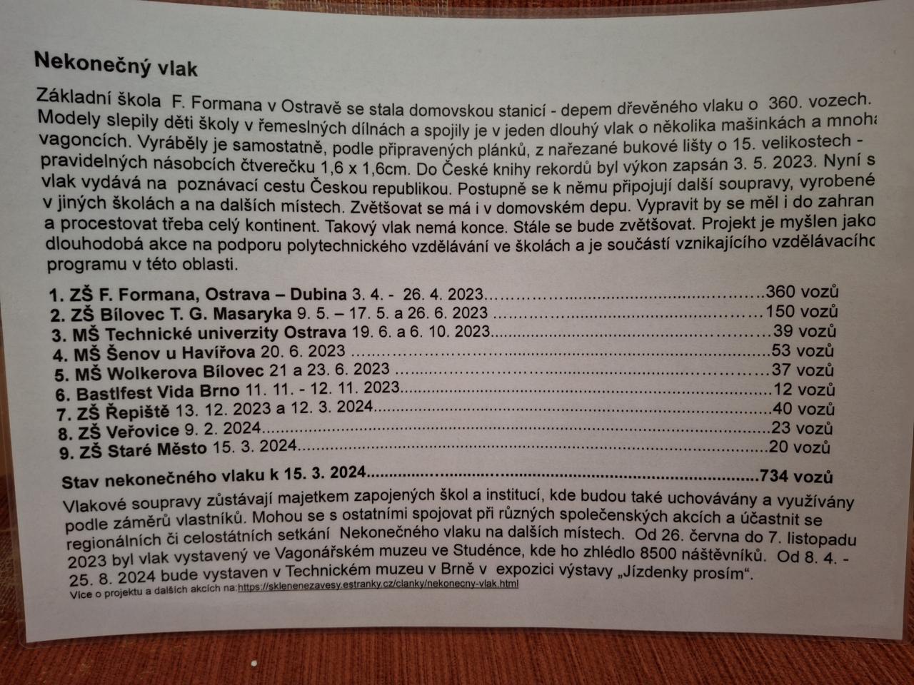 Ve dnech 2. a 9. května se naše děti přidaly k celorepublikovému projektu Nekonečný vláček. Každý žák vyrobil samostatně podle připraveného plánku vagónek, který se pak připojil k dalším a vzniká tak nekonečně dlouhý vlak, který nemá konce.